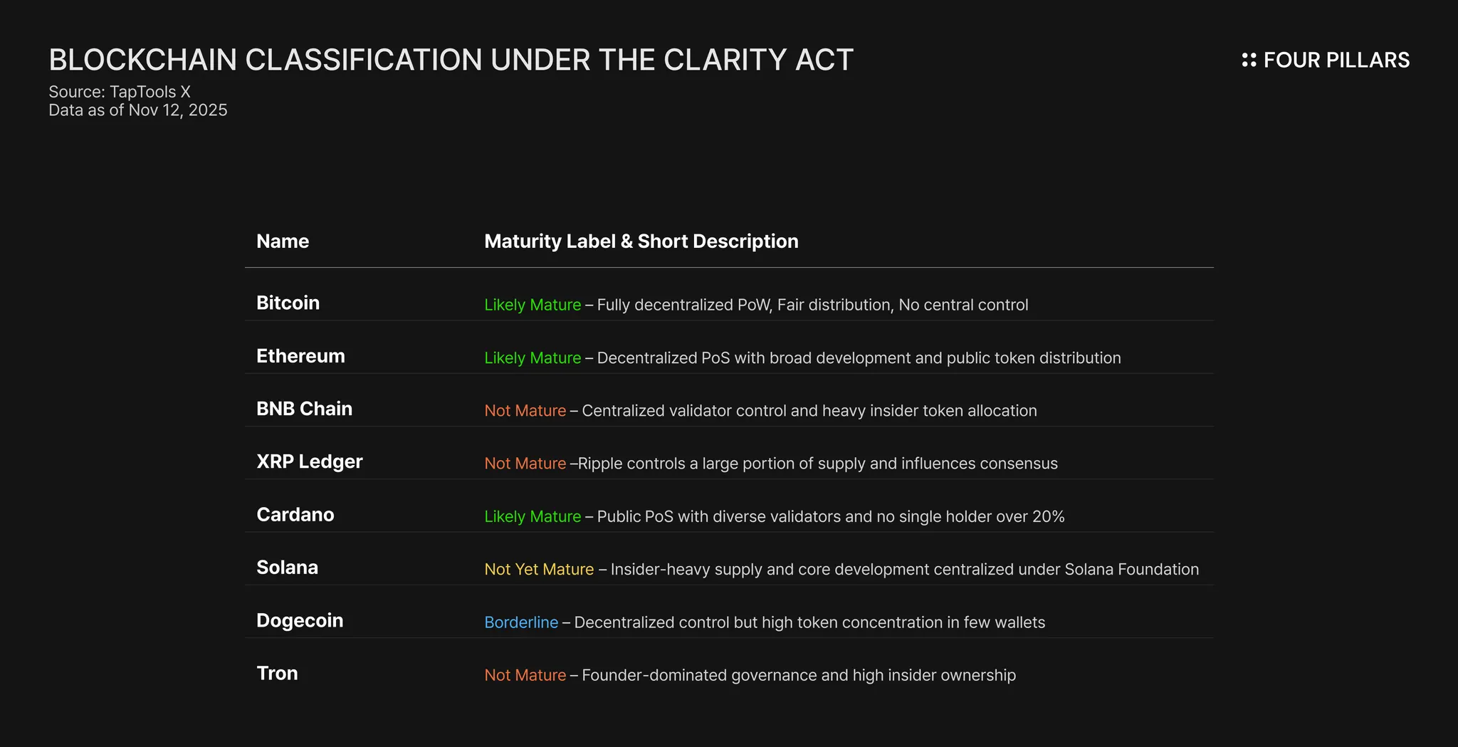 这种看法在2024年末现货以太坊ETF继比特币之后获得批准时得到加强,并在2025年7月《清晰法案》通过时更加巩固。该法案奠定了将比特币、以太坊和Cardano等加密货币归类为数字商品的基础。通过将这些区块链识别为“成熟区块链”,以太坊摆脱了被归类为证券的风险,并巩固了其作为“商品期货交易委员会(CFTC)”管辖下的商品的地位。