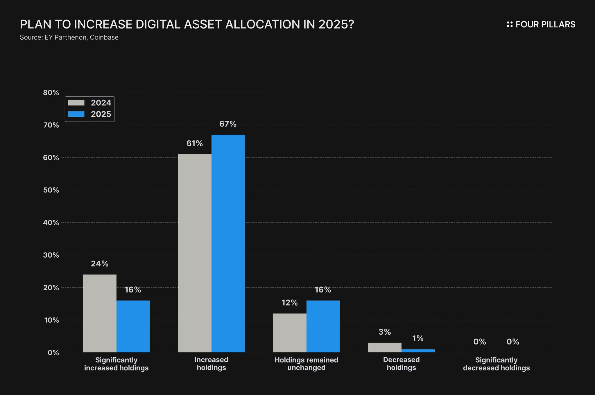 2025年是机构投资者开始认真进入加密货币市场的一年。随着监管变得更加清晰和市场成熟,机构开始将加密资产视为战略性持有物,因为它们具有高回报潜力和投资组合多元化的优势。根据安永(EY)2025年的调查,83%的全球机构投资者表示,他们计划在2025年内增加其数字资产的配置。