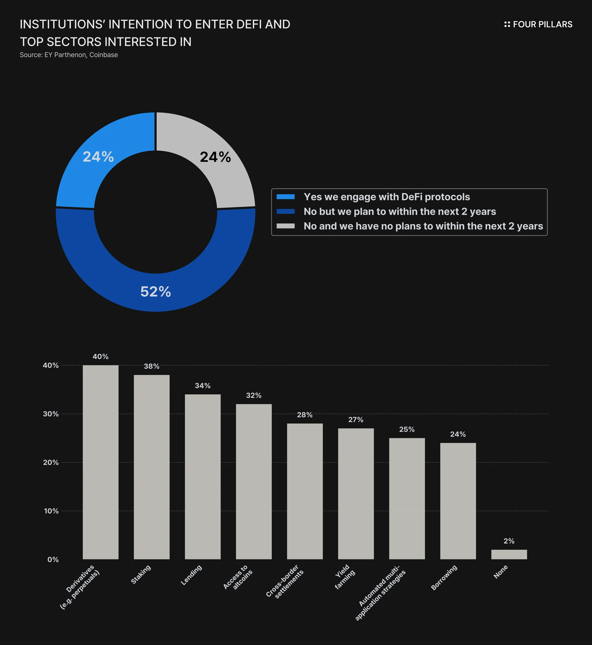 根据安永(EY)的一项调查,52%的机构投资者计划在未来2年内直接参与DeFi协议,24%已经在使用DeFi。机构对以太坊DeFi领域表现出浓厚的兴趣,如质押(40%)、衍生品(38%)和借贷(34%)。