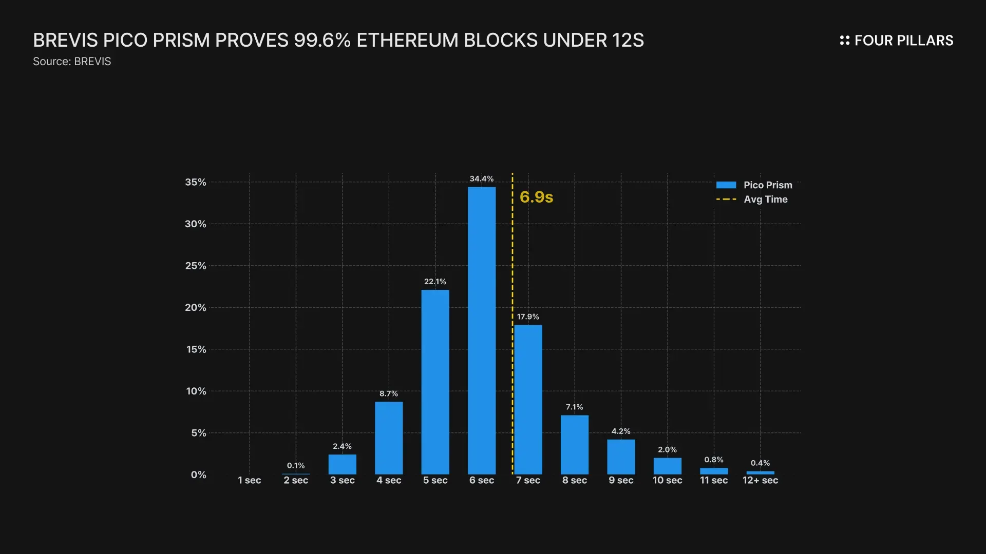 Brevis 的 Pico Prism 目前在速度和效率方面最为突出。使用 64 个 RTX 5090 GPU,它平均在 6.9 秒内证明 99.6% 的 45M gas 以太坊区块,从而提供最接近以太坊基金会 RTP 基准的性能。Pico Prism 旨在打造个人可以在家生成证明的家庭证明新时代,它通过提高成本效益,其模块化架构针对可验证的 AI 和智能 DeFi 应用程序。