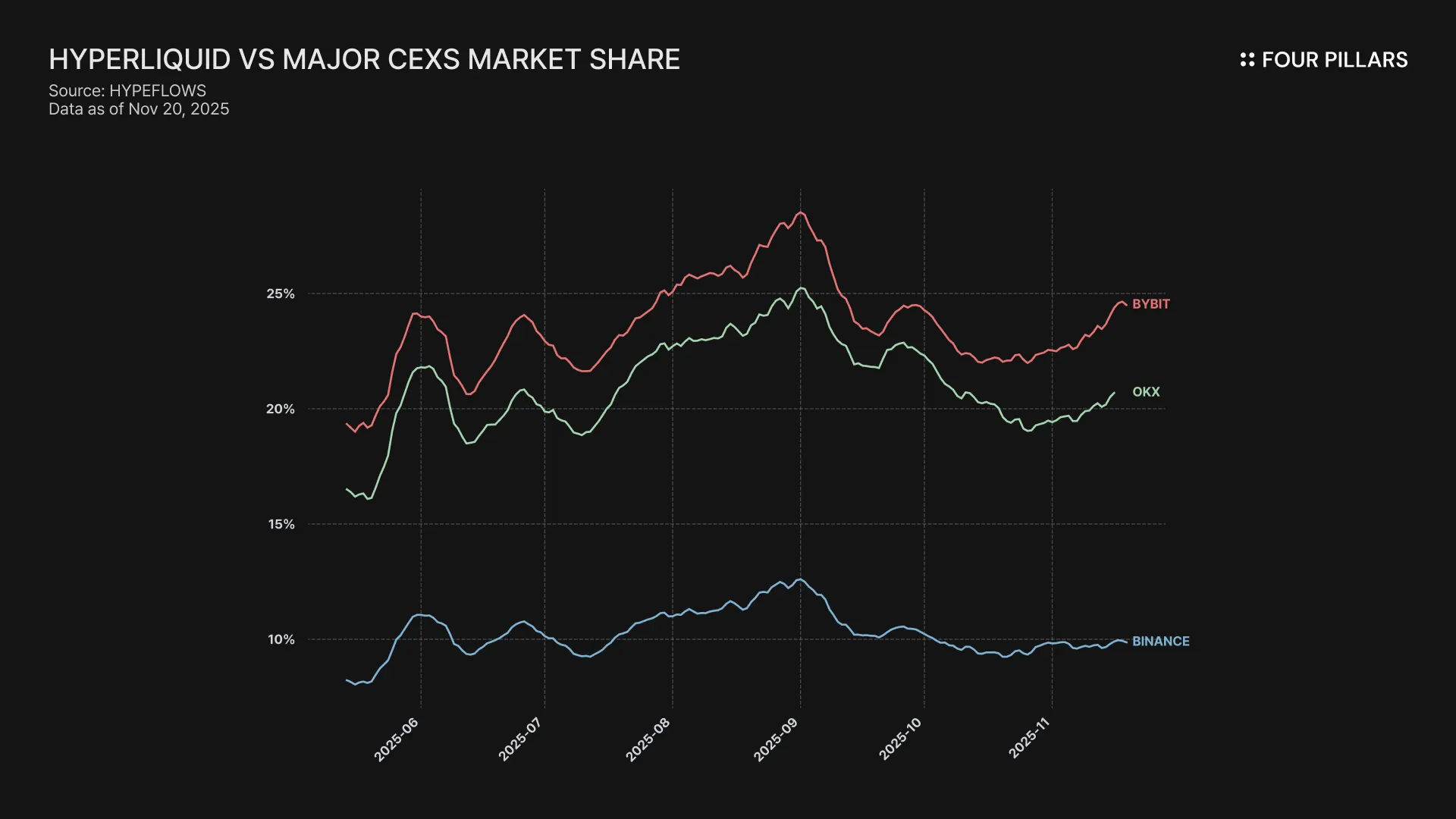 因此,Hyperliquid 迅速成为无可争议的交易量和活跃交易者排名第一的 DEX,占据了大约 5% 的整个 CEX 市场,并且 持续达到 Binance 交易量的 10% 以上——对于去中心化平台来说,这是一项了不起的成就。这种爆炸性增长引起了主要机构、风险投资公司和影响者的关注——所有人都将 $HYPE 视为价值数亿美元的战略资产——而 Hyperliquid 的用户群继续以加速的速度增长。