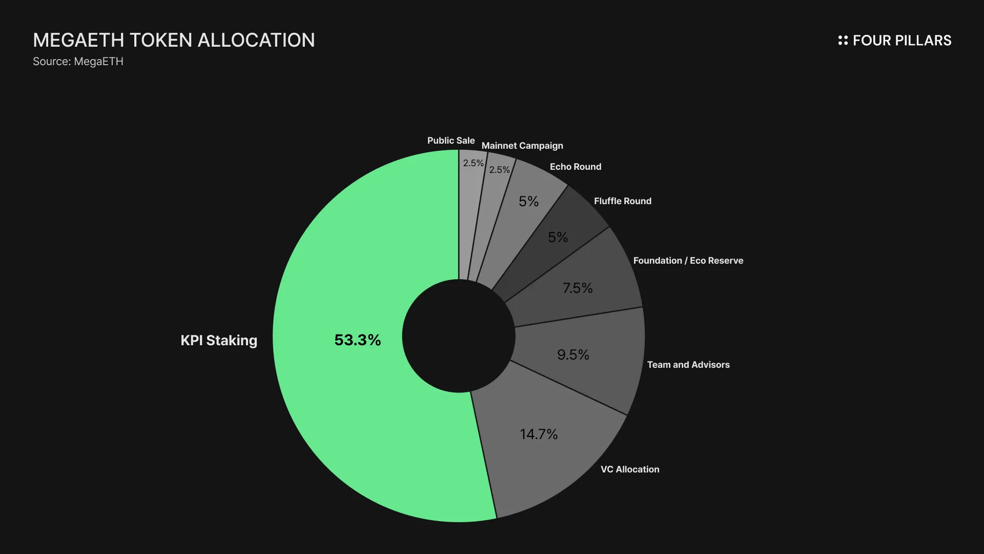 在社区方面,MegaETH 应用了相同的深思熟虑的策划理念。该团队仅向那些具有为生态系统做出贡献的明确潜力的人员授予特殊利益。这包括选择性地分发大约 10,000 个限量版 SBT,称为“Fluffles”,以及一个价值 5,000 万美元的预售,该预售避开了大规模的公众参与,而选择了一小群预计将为网络长期发展做出贡献的合格团体。这些早期参与者还可以独家访问未来的激励计划。此外,代币经济学中包含 KPI 质押,可确保奖励主要分配给与网络增长保持一致的贡献者——进一步加强生态系统参与者与链的长期发展轨迹之间的激励对齐。