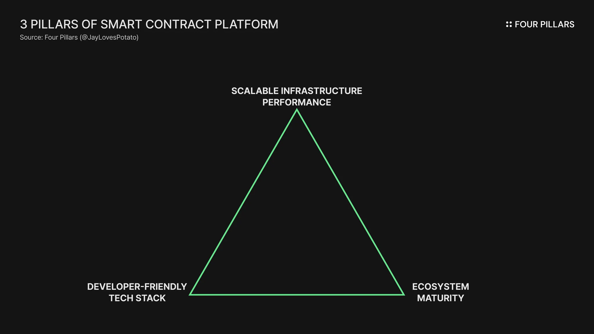 现在去中心化的绝对定义变得越来越模糊,下一代智能合约平台的核心竞争因素——假设满足合理的去中心化基线——可以提炼为三个要素:1) 可扩展的基础设施性能,2) 对开发人员友好的技术堆栈,以及 3) 生态系统成熟度。