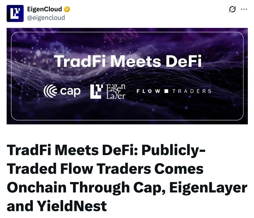 2025 年 11 月,Flow Traders 是 Euronext 上市的全球最大的流动性提供商之一,通过 Cap、EigenLayer 和 YieldNest 进入链上。