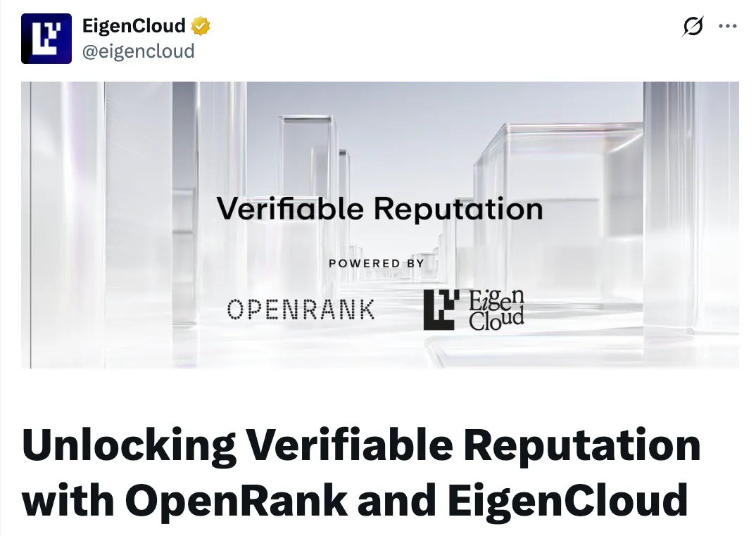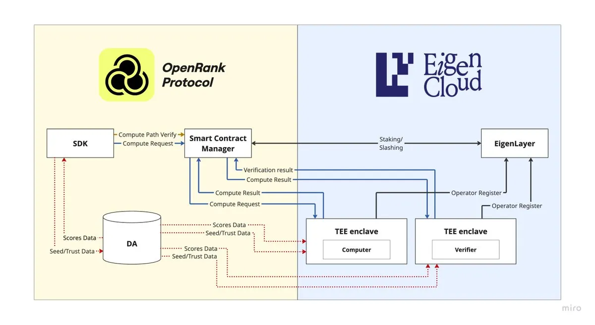 EigenCloud 提供了使此验证成为可能的基础设施。 OpenRank 的计算节点在 EigenCloud 的 TEE 中运行声誉算法,并且单独的验证器节点使用相同的输入独立确认结果。 所有输入和输出都存储在任何人都可以访问的数据可用性层中,并且结果的加密承诺记录在链上。 如果验证者发现差异,他们可以提出质疑,并且不诚实的运营者将其在 EigenLayer 上质押的资产 slashing。