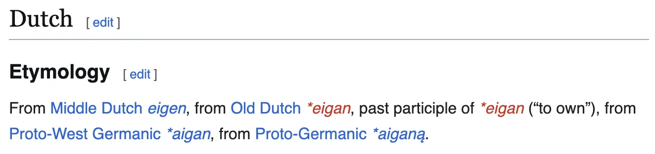 Eigen。一个中古荷兰语单词,意思是“固有的”、“原始的”或“真正属于自己的”。