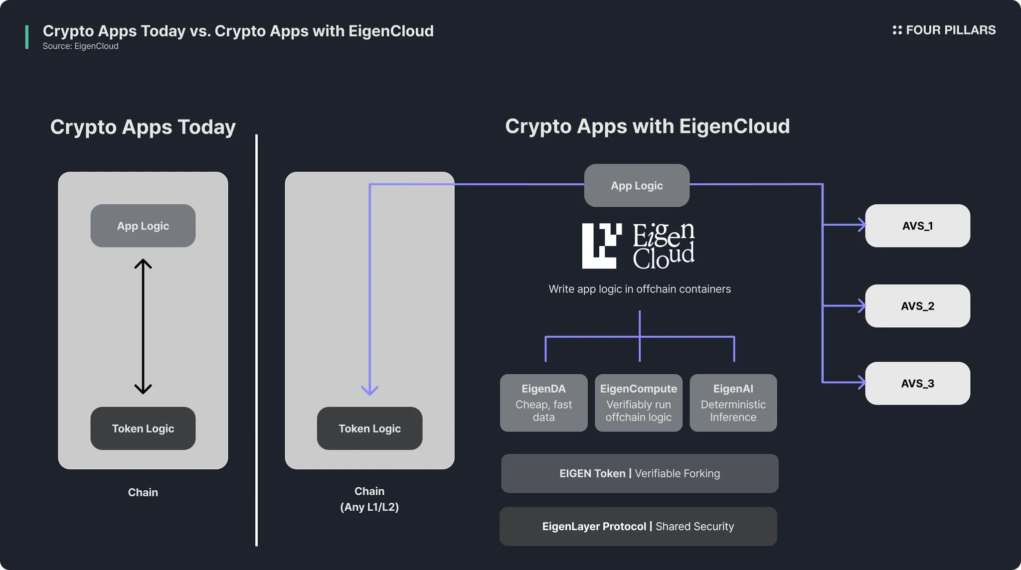 要理解 EigenCloud 的结构,首先必须掌握其设计原则。正如前面所研究的,EigenCloud 建立在 EigenLayer 的共享安全之上,贯穿其中的核心思想是“解耦”。在现有的区块链中,代币和应用程序逻辑都在链上处理,但 EigenCloud 将这两者分开。像托管、转移和罚没这样的核心金融功能仍然在链上,直接利用现有区块链的可验证性,而像业务规则、复杂计算和外部系统集成这样的应用程序逻辑在链下环境中运行。