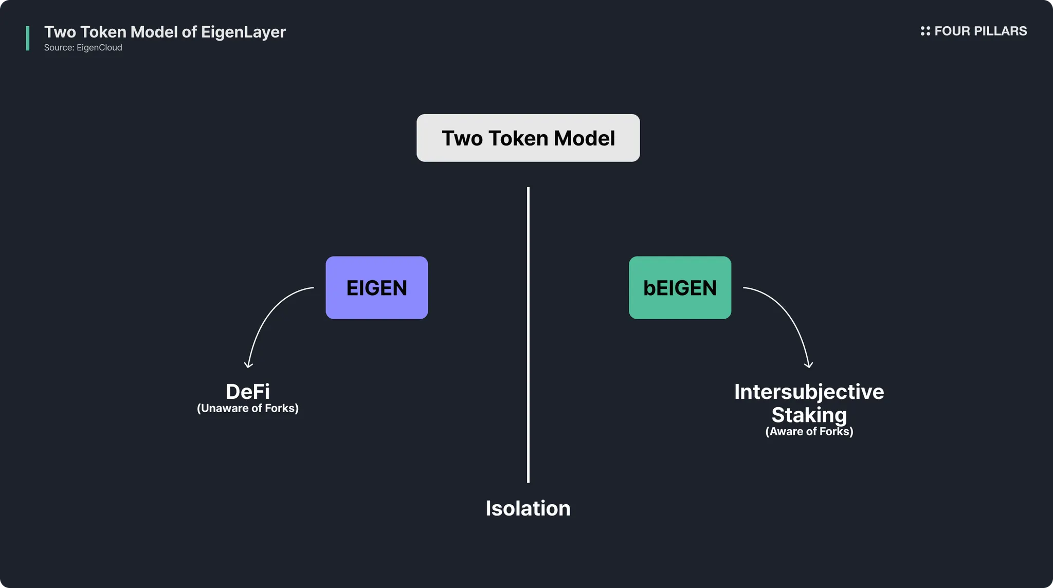 EIGEN 的双代币模型使这成为可能。EIGEN(ERC-20)是一种标准的可转让代币,可以在 DeFi 中使用或在交易所交易;持有者无需参与分叉争议。相比之下,bEIGEN 是质押 EIGEN 时获得的表示,是一种自愿承担罚没风险并参与协议安全的承诺。由于这种分离,一般代币持有者可以享受代币的经济价值,而不会被卷入分叉政治,只有质押者承担验证责任及其相关风险。
