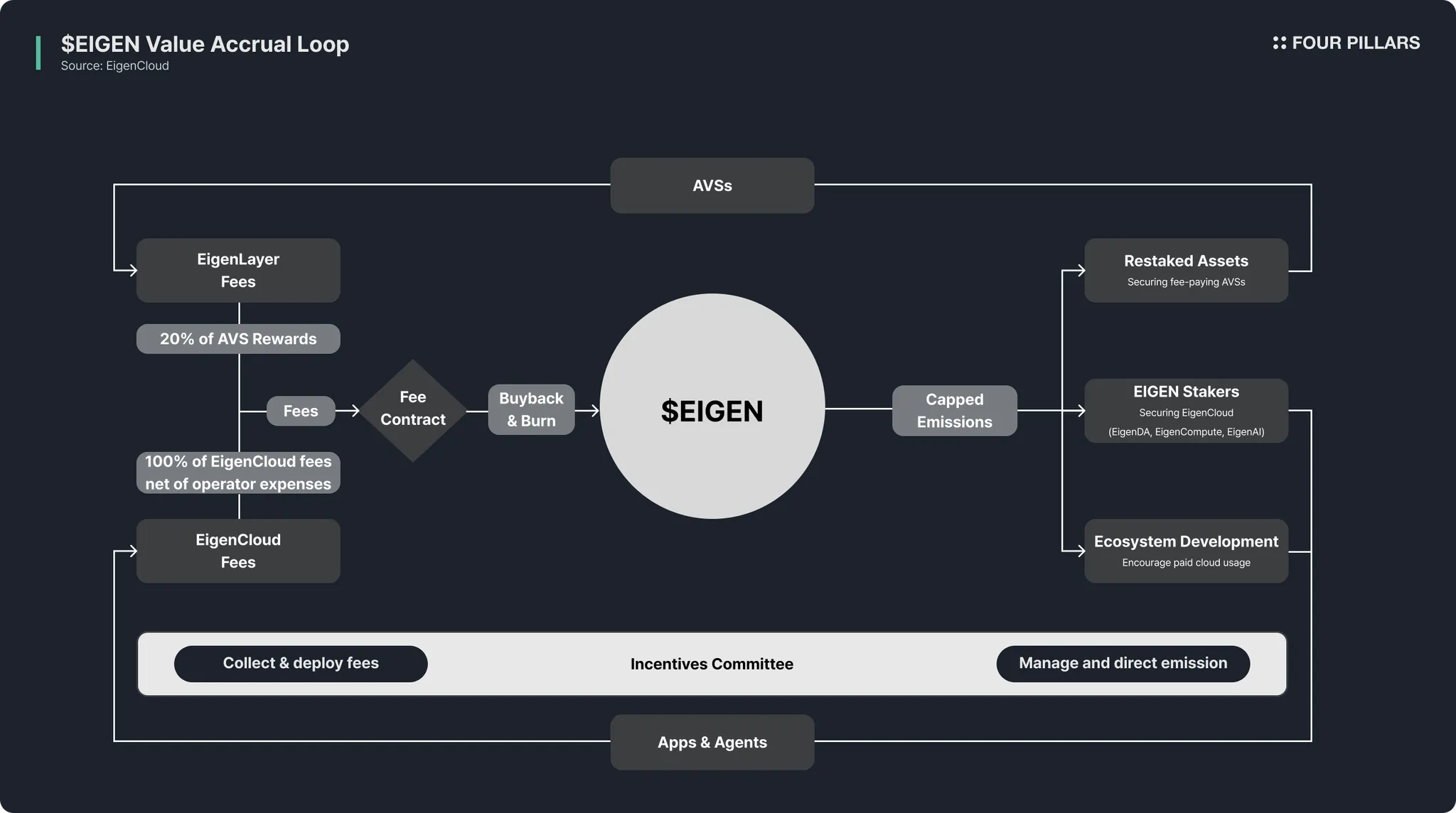 为了使两个飞轮持续旋转,必须适当调整参与者的激励措施。 2025 年 12 月,Eigen Labs 和 Eigen Foundation 提出了 ELIP-12,旨在建立一个新的激励委员会。 核心思想是将 token 排放 направляющие 用于实际创造价值的参与者,并将产生的费用 обратно 给 EIGEN token 持有者。