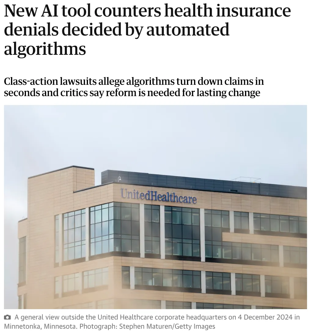 2023 年 11 月,一起集体诉讼案被提交给了美国最大的健康保险公司 UnitedHealth。核心问题是,该公司涉嫌使用一种名为“nH Predict”的 AI 算法来不当拒绝老年患者的保险索赔。该算法分析了患者的诊断、年龄和生活状况,以“预测”护理持续时间,并且无论主治医生的意见如何,保险支付都会在预测的时间被切断。