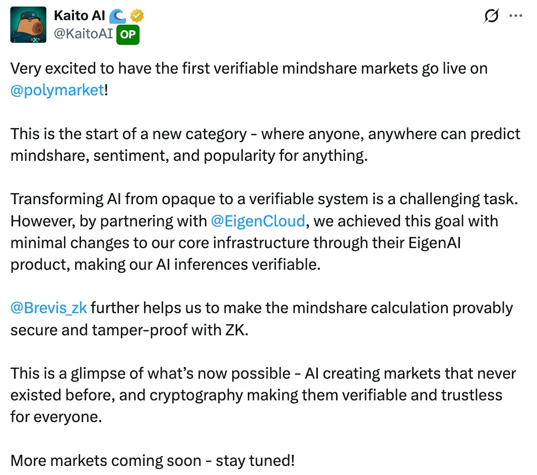 他们试图通过使用 EigenCloud 的 EigenAI 的可验证性来解决 Kaito 模型的信任问题。 Kaito 的 AI 模型在 EigenAI 上运行,因此任何人都可以在相同输入数据下重现相同的分析,并且 Kaito 能够证明其算法是通过 EigenAI 精确执行的,而无需公开其算法。