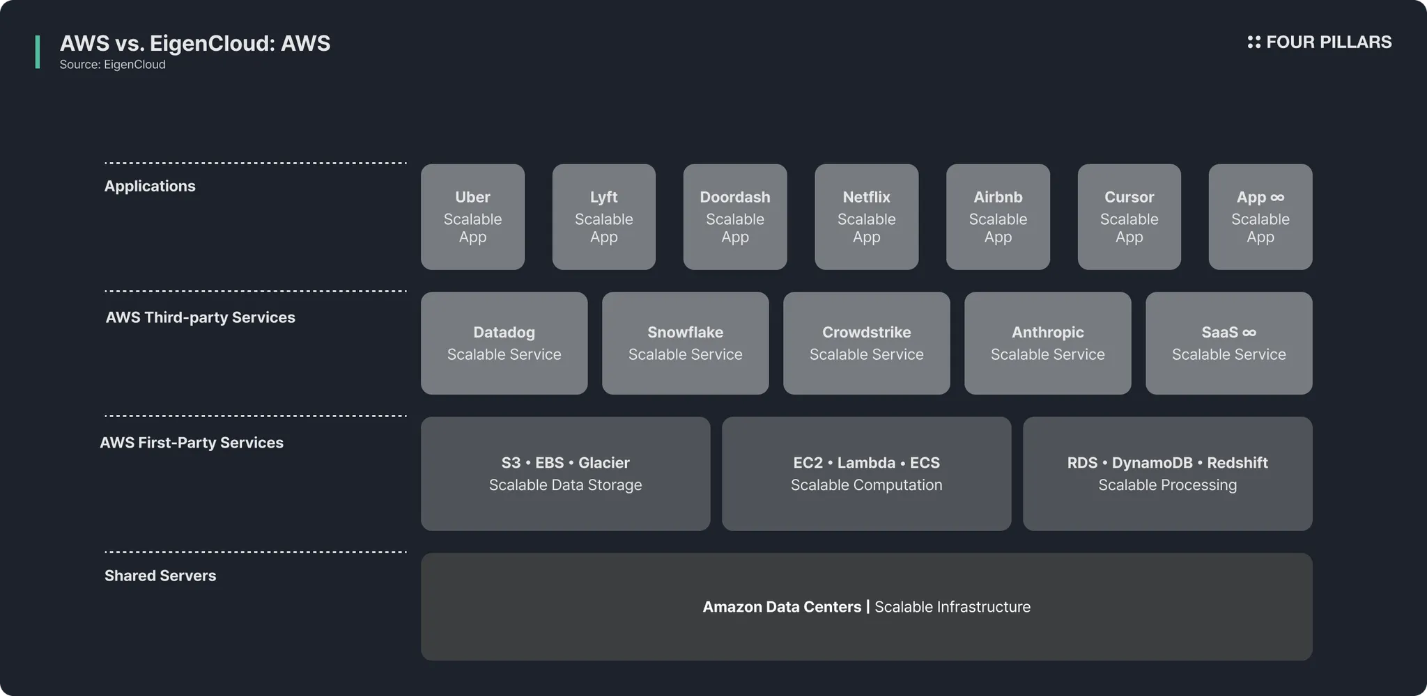 EigenCloud 的角色类似于 AWS 给互联网带来的变化。当时,公司必须购买自己的服务器并租赁数据中心来运行网站,但 AWS 改变了这一点。通过解除基础设施建设的重担,公司可以专注于应用程序开发。