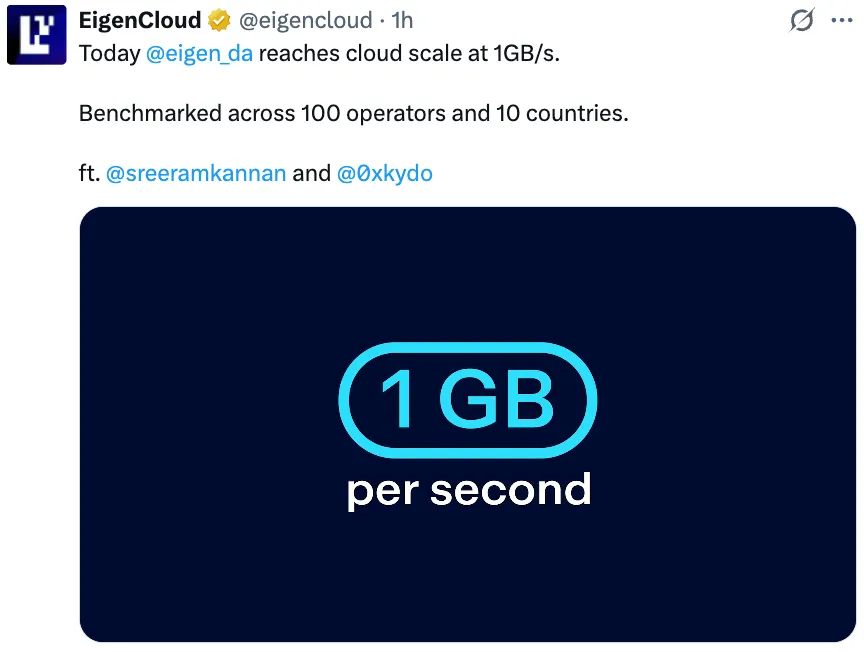 不仅如此,在 2025 年 12 月,EigenDA 通过其专有数据库 LittDB 实现了每秒 1 GB 的云级别数据吞吐量。