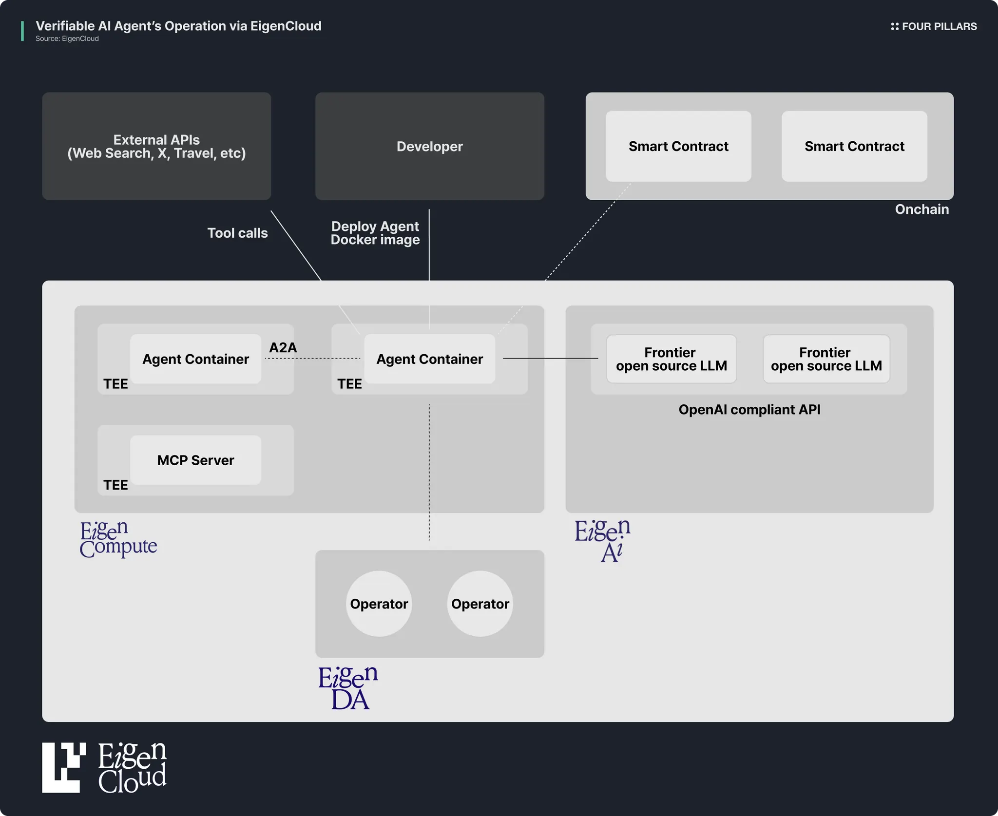 EigenCloud 由四个组件组成,它们支持共享安全、分布式数据存储、隔离执行环境和确定性 AI 推理。它们的结合提供了关于计算执行过程和结果完整性的可验证答案。