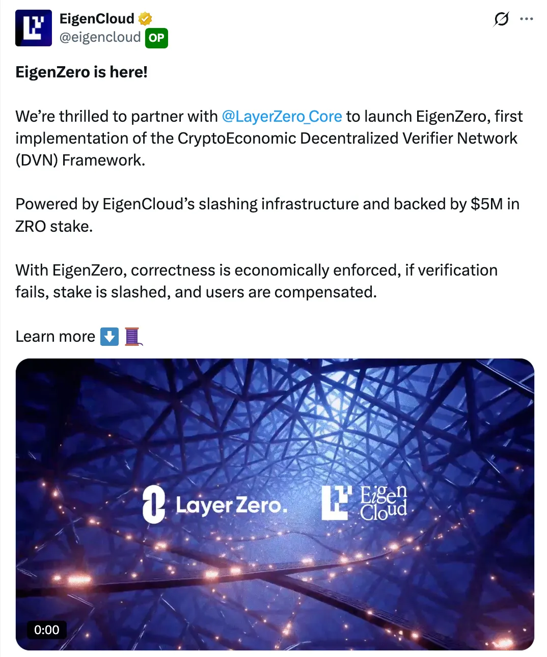 2025 年 11 月,LayerZero 推出了 EigenZero,这是一个利用 EigenCloud 的重新质押基础设施的密码经济 DVN 框架。 通过引入可 slashing 抵押品作为额外的安全层,验证器现在可以为应用程序提供针对恶意行为的经济威慑。