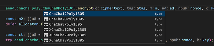 aead.chacha_poly.ChaCha8Poly1305.encrypt(ciphertext, &tag, m, ad, nonce, key);