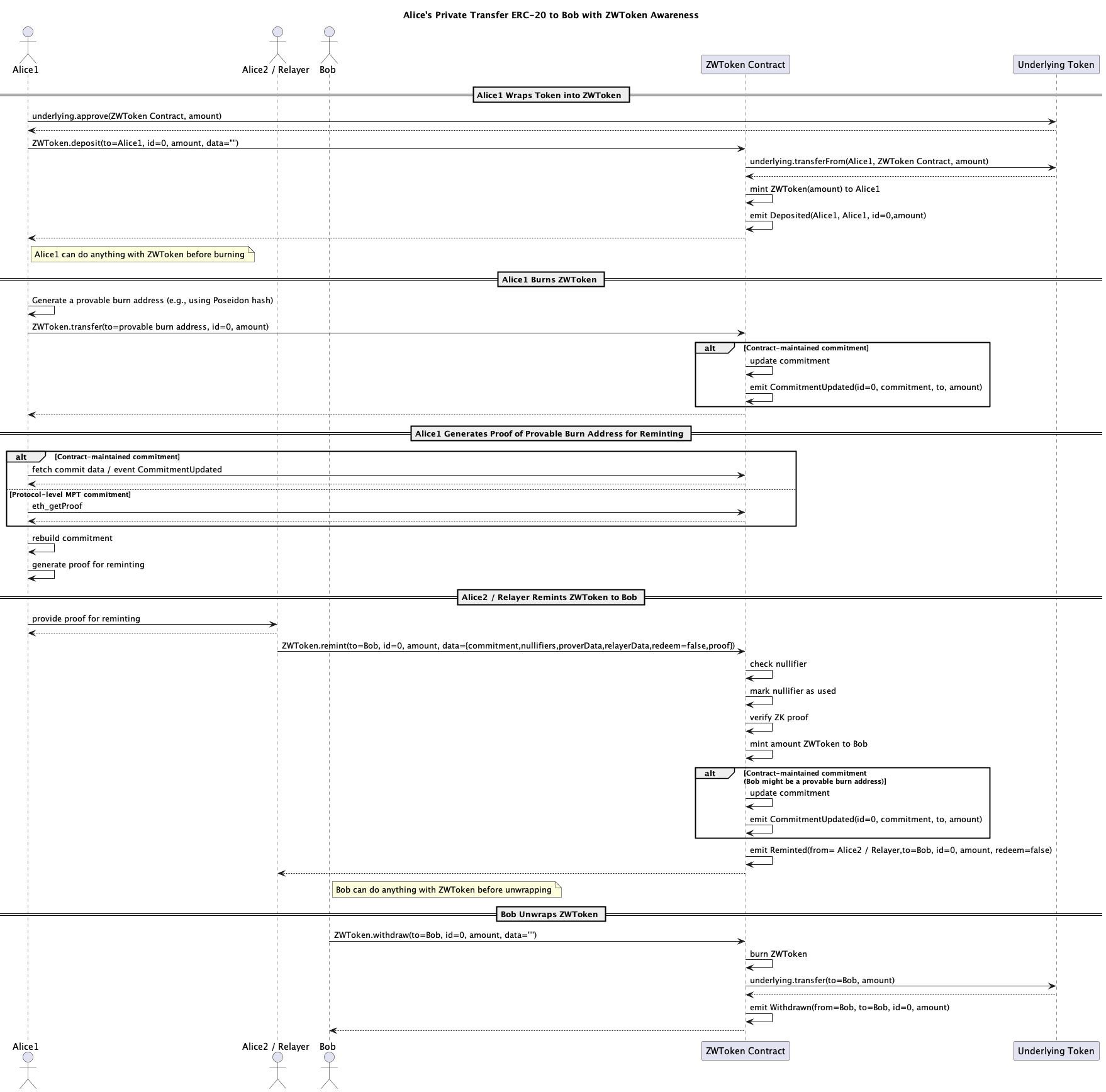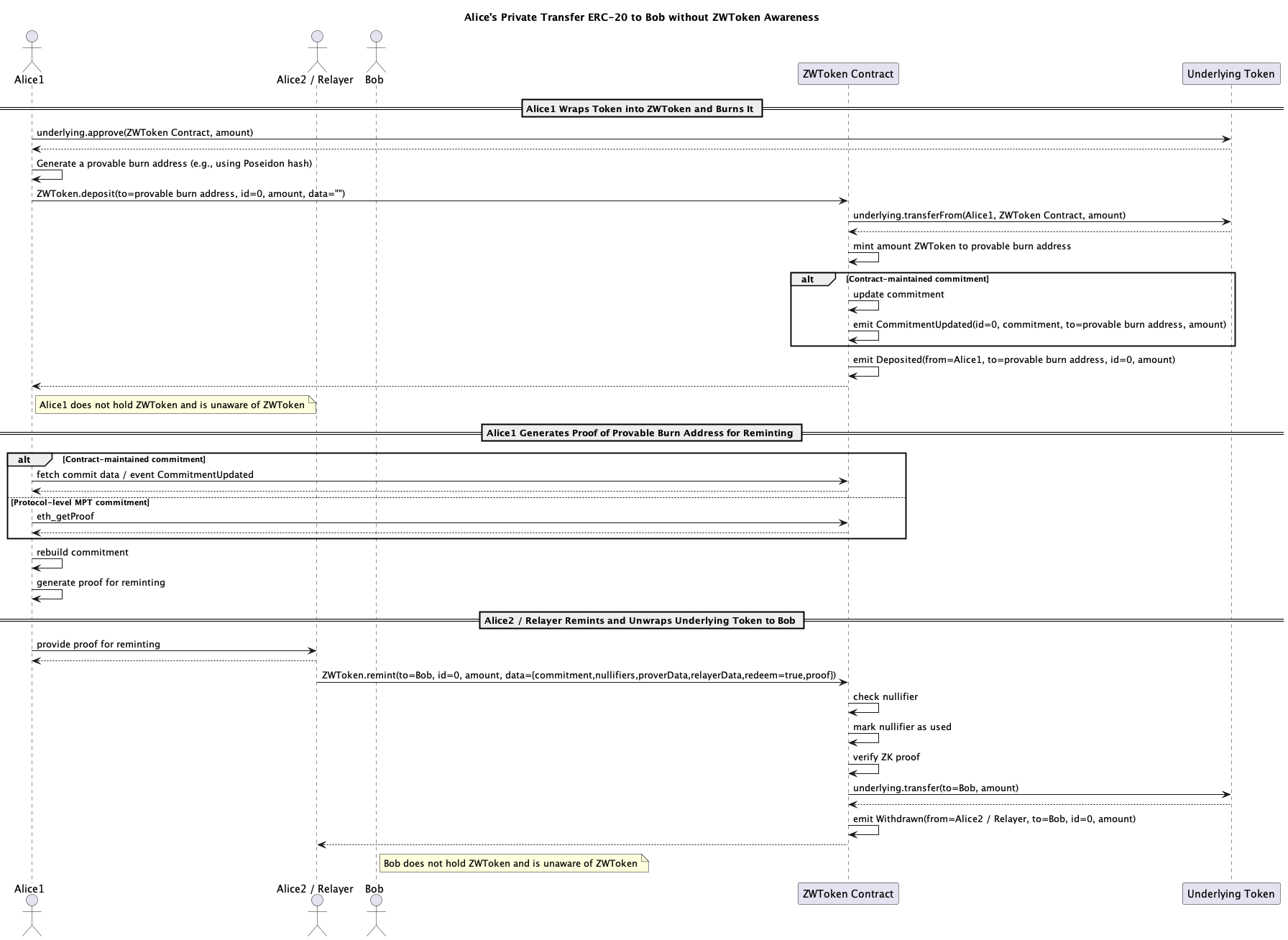 Alice 可以 transfer(在 ZWToken 感知工作流中)或 depositTo(在 ZWToken 非感知工作流中)将 ZWToken 转移到 Bob 的可证明销毁地址,而不是她自己的地址。在这种情况下,再铸造操作由 Bob 而非 Alice 发起并证明。