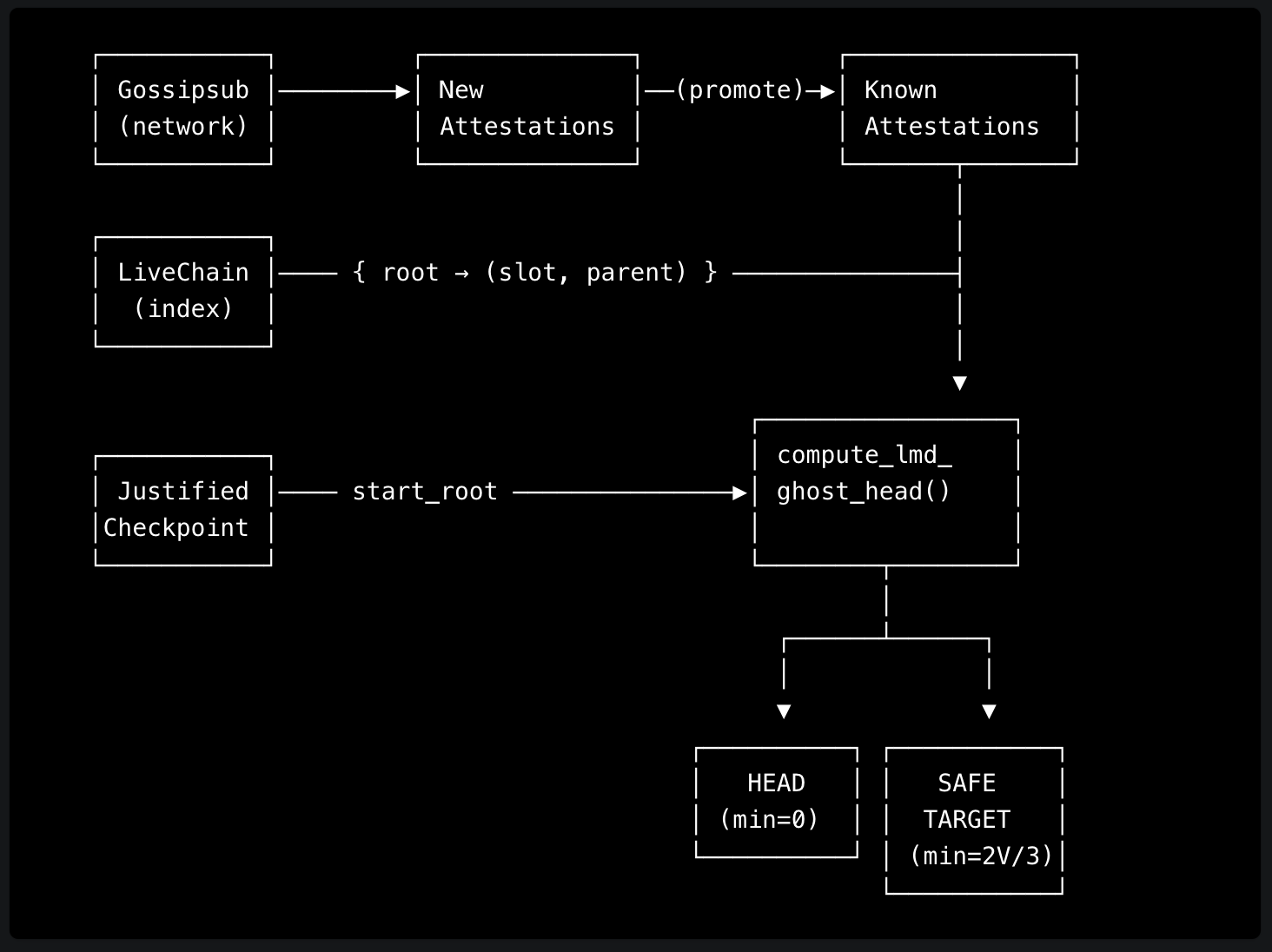 在 ethlambda 中,核心函数是 crates/blockchain/fork_choice/src/lib.rs 中的 compute_lmd_ghost_head()。