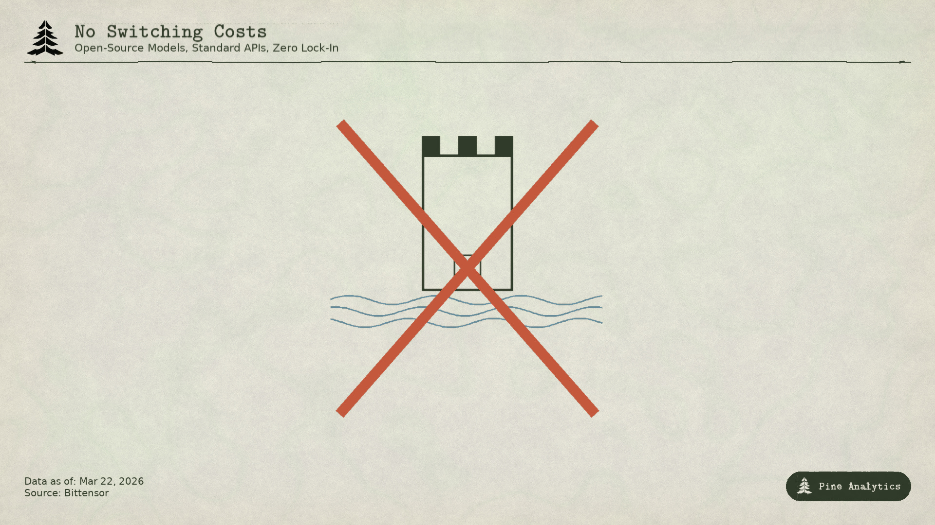 传统护城河(专有技术、网络效应、转换成本、品牌)不适用。技术是开放的。网络效应体现在 TAO 上,而非单个子网。当每个提供商都提供相同的权重时,转换成本为零。社区认为激励机制是护城河,但这要求发行预算足够大以吸引计算资源,而它会随着每次减半而缩小。