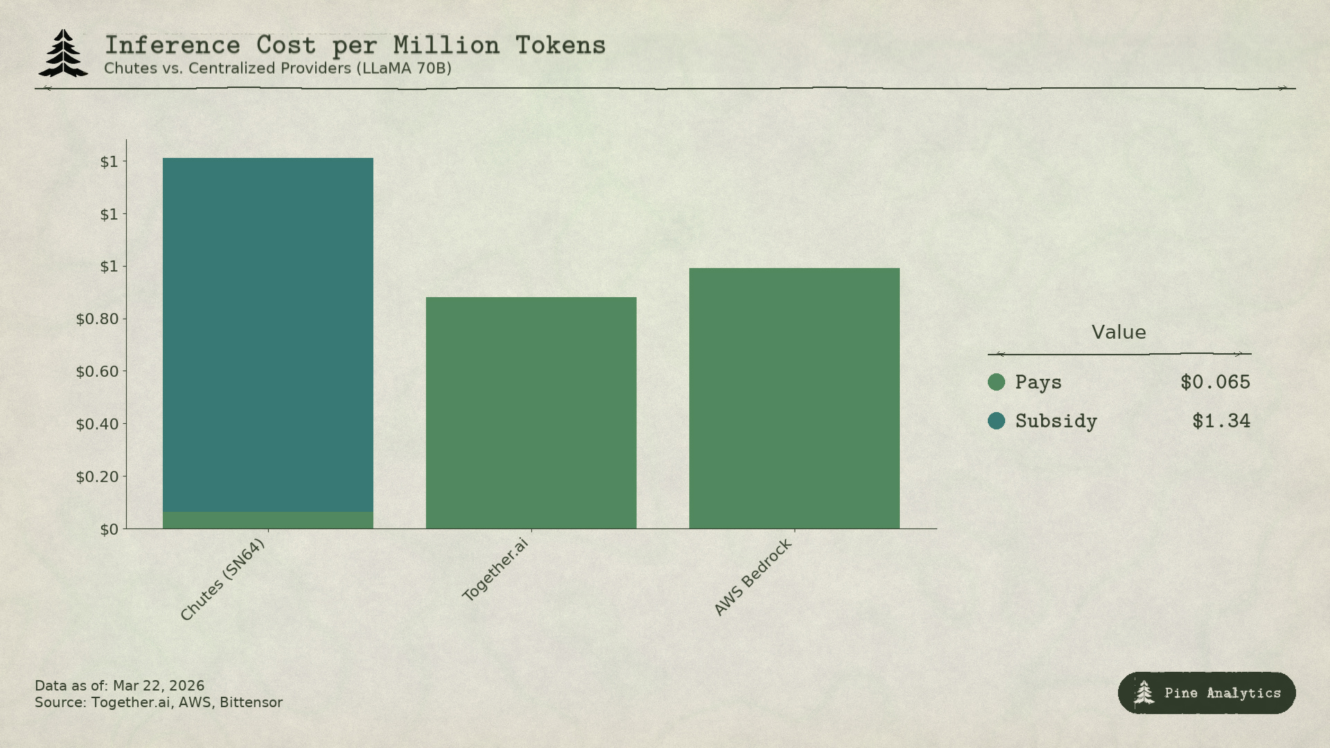 当前相同开源模型的市场价格:Together.ai 对 LLaMA 3.3 70B Turbo 的定价约为每百万 tokens 0.88 美元。DeepSeek V3 在有竞争力的提供商之间定价为 0.40-0.80 美元。较小的模型甚至低至每百万 tokens 0.18 美元。以每百万 tokens 1.41 美元计算,无补贴的 Chutes 定价将比中心化替代方案贵 1.6-3.5 倍。成本优势没有缩小,反而完全颠倒了。Chutes 讨论中经常强调的 85% 节省是由 TAO 持有者通过通货膨胀资助的,而非去中心化的任何结构性效率。