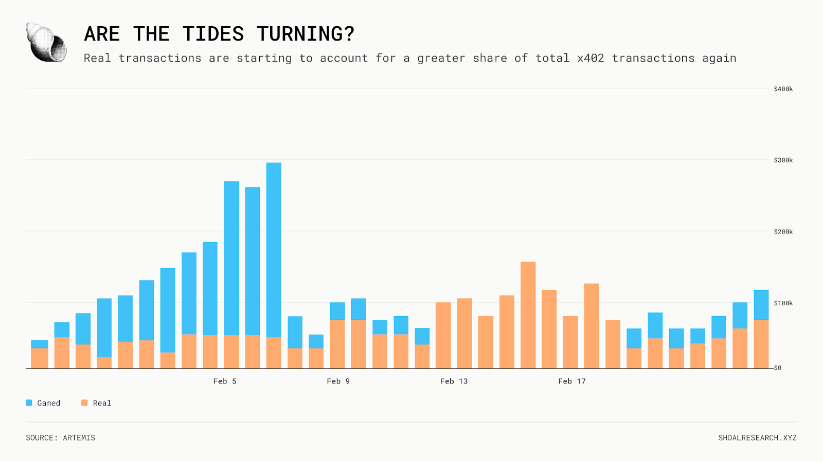 然而,随着过去几个月 x402 总交易量有所下降,真实交易开始占据总交易数更大份额。2 月份连续五天真实交易占总交易数的 100%。