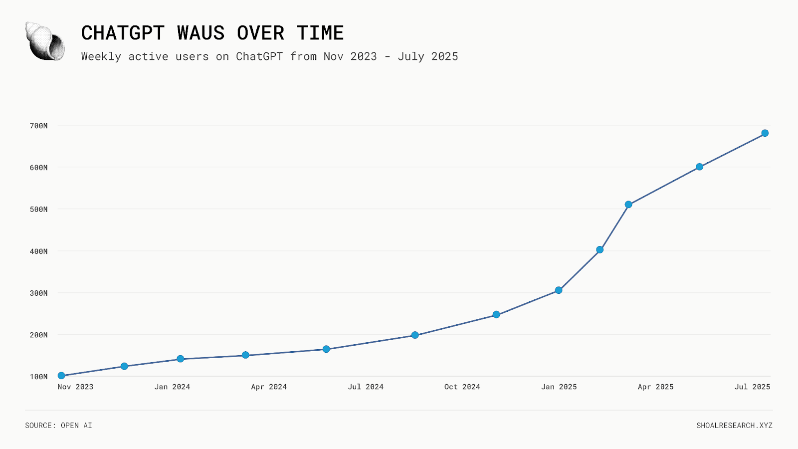 OpenAI 推出了 ChatGPT,提供了一种简单直观的方式与其底层 GPT 模型进行交互,该模型在 5 天内达到了 100 万用户,2 个月内达到了 1 亿用户,是历史上消费者互联网采用速度最快的。此后不久,竞争性生成式人工智能应用程序(例如 Gemini、Claude、Grok)开始推出,随之而来的竞争促使主要人工智能实验室迅速改进模型并推出新的产品功能。从消极的一面来看,随着企业高管继续迭代裁员并增加对 AI 的投资,对工作岗位流失的担忧日益加剧(尽管值得注意的是,今天超过一半的美国工人从事的是 1940 年不存在的工作)。