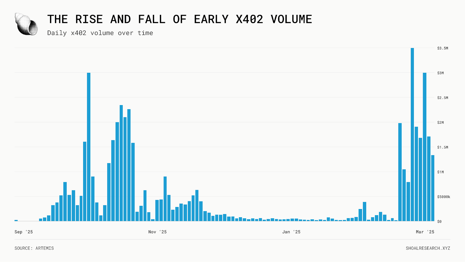 这种增长并非线性;在 11 月 17 日达到峰值时,x402 推动了 Base 每日 1700 万笔交易的 19%,这惊人地证明了该协议能如此迅速地饱和单条链的活动。此后,尽管链上和加密市场活动普遍回落,交易量显著下降,但 3 月份交易量和交易笔数再次显著回升。