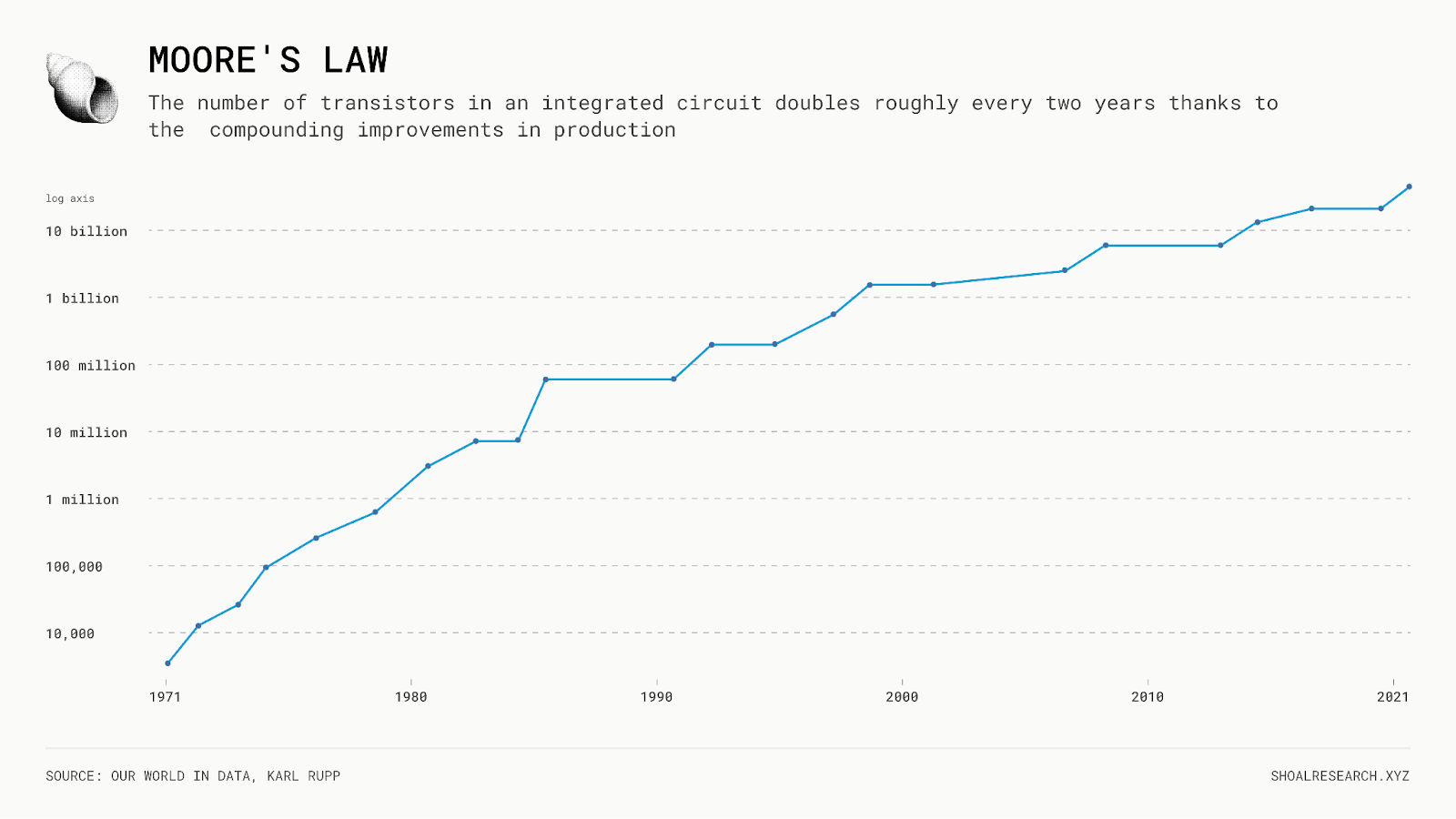 基础性发明,无论是苏美尔轮子、古腾堡印刷机还是蒸汽机,都产生了一个类似的强化飞轮:人类制造机器,这些机器产生经济盈余,从而有更多的资金用于制造更多的机器(而且是更好的机器),这进一步复合式增长产出。随着技术的改进,实验成本下降,而迭代速度增加。我们已经看到这种动态在过去几十年中,特别是随着计算机及其围绕它们构建的应用程序和服务,加速发展。