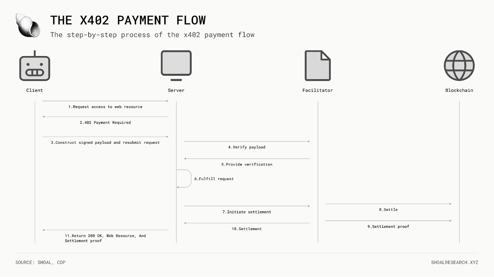 关键的是,协调器不是托管人。它执行的是已经通过客户端签名加密授权的转账。它不能重定向资金或修改支付条款;它只能执行或拒绝客户端已经签署的内容。Coinbase 在 Base 和 Solana 上运行一个用于 USDC 支付的协调器,但这个角色是开放的。任何服务器都可以在本地运行自己的验证逻辑,如果它不想外包的话。