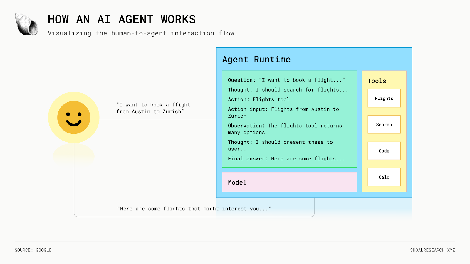 用户输入一个提示,然后将其传递给Agent的运行时环境。从那里,Agent向其模型提供一个提示,该模型做出决策并作为操作的大脑。Agent使用其可能访问的任何可用工具(即网络浏览器、API、数据库、日历等)来执行这些任务,然后执行一个吸收其行动信息、推理信息并使用这些信息来确定其下一个行动或决策的循环,直到达到定义的停止点(例如,用户提示中指定的目标)。