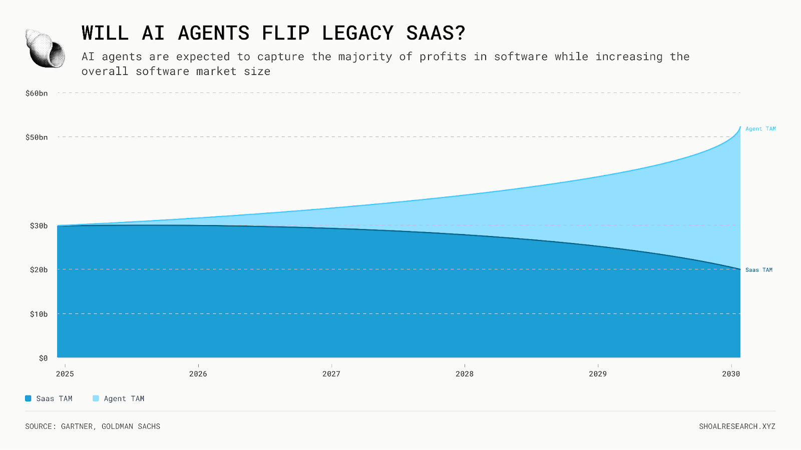 Gartner 预测到 2026 年底,大约 40% 的企业应用程序将嵌入特定任务的 AI Agent。McKinsey 估计到 2030 年,AI Agent将占据全球消费者商务 3-5 万亿美元的份额。高盛预计,到 2030 年,即使 AI Agent扩展了整体软件市场,它们也可能侵蚀 SaaS 有意义的潜在市场(TAM),成为知识工作的主要界面。