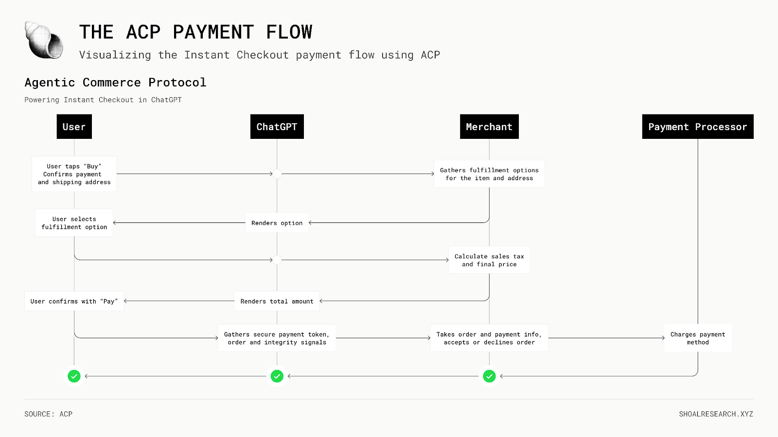 显而易见的是,这已经成为可能。AI Agent已经可以访问每年有数万亿美元在线流动的现有基础设施。这些系统围绕我们称之为结账专用流程而构建。一个(人类)用户确认其购买意图,为该交易创建支付Token,然后商家通过其各自的 PSP 基础设施处理支付。