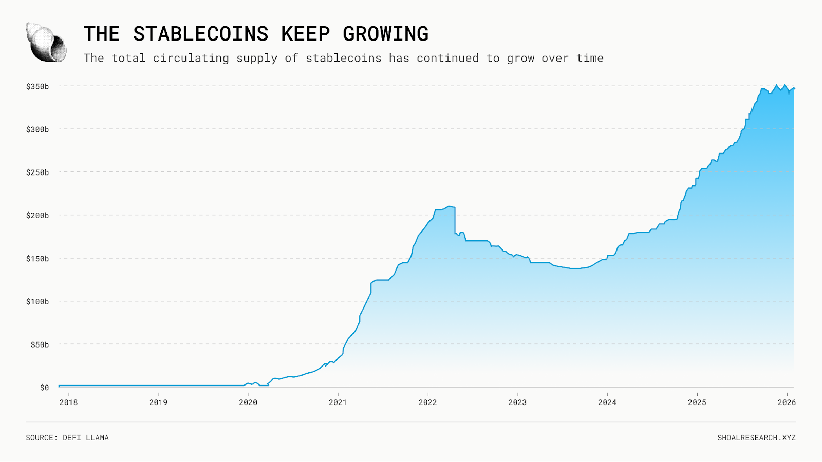 正如 HTTP 在互联网上自由且无需许可地传输信息一样,公共区块链通道上的全球价值转移已经以有意义的规模发生。数万亿美元的稳定币已经转移。目前流通中的稳定币供应量超过 3080 亿美元。
