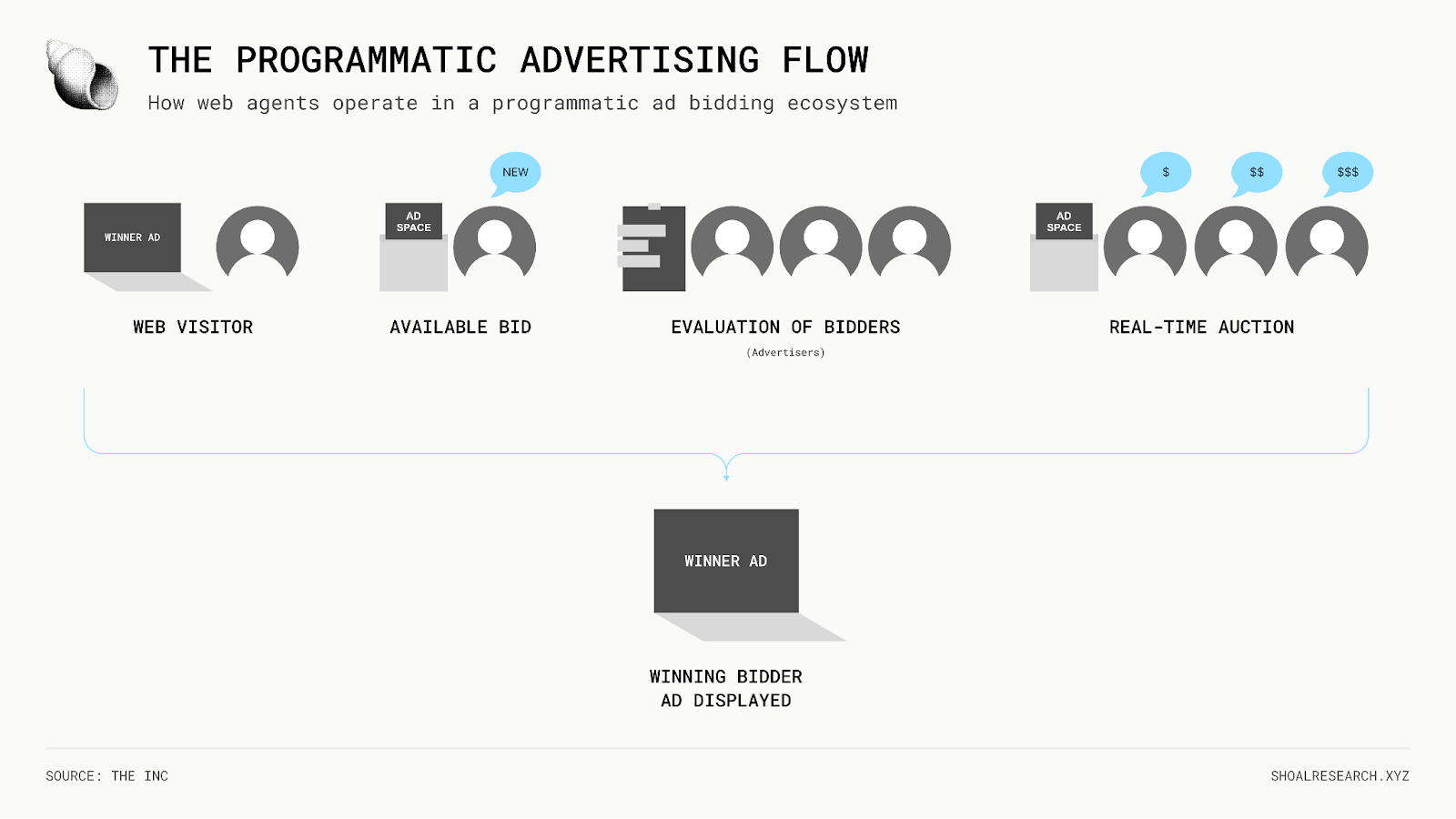 每当有人加载一个网站时,空白的广告位就会被放入一个小型拍卖中出售,代表广告商(可以是任何在线销售商品的商家)的Agent会确定该广告位的价值并提交竞价。出价最高者获胜,获胜的广告在几百毫秒内被渲染到广告位中。当网站加载时,广告已经显示出来。为了了解这种规模,请考虑程序化数字广告支出每年达数千亿美元,这占据了今天展示广告预算的 90% 以上。