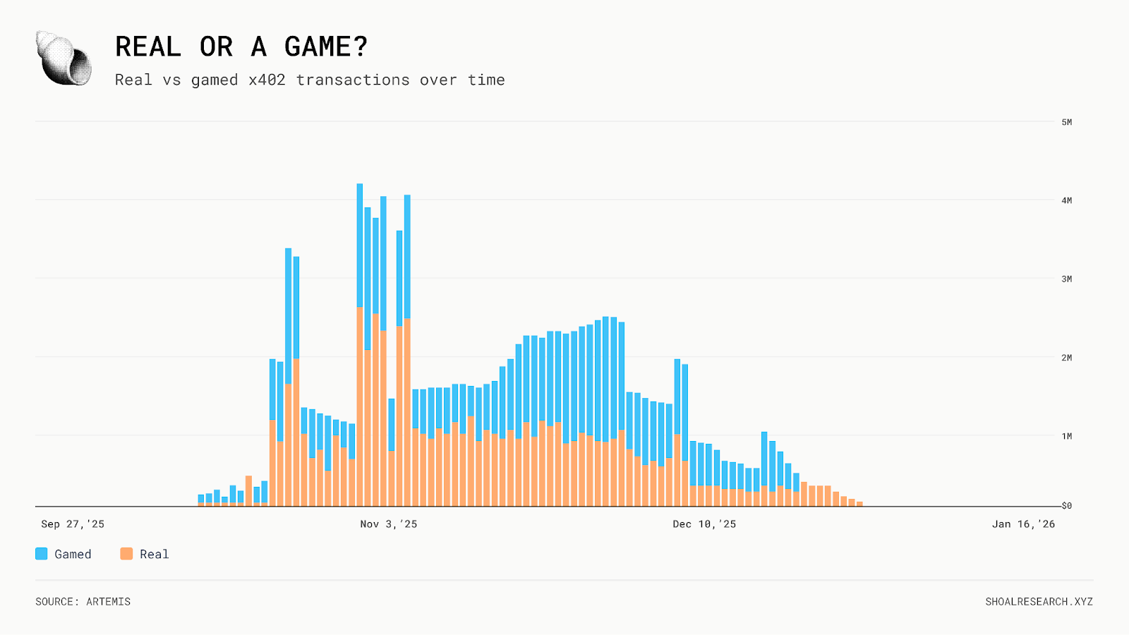 尽管 x402 于 2025 年 5 月上线,但第一次主要的活动激增仅在几个月后的 25 年第四季度早期发生。其中大部分活动与 memecoin 相关;在 11 月和 12 月初的大部分时间里,被操纵的交易在总交易中占比较大,高于真实交易。