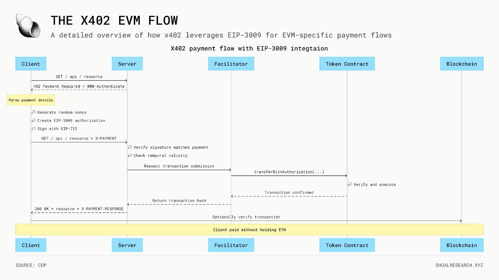 如果所有检查都通过,服务器或其协调器调用代币合约上的 transferWithAuthorization。协调器从其自身余额中支付 gas 费用,这就是为什么客户端只需持有支付资产,而不是链的原生 gas 代币。一旦确认,服务器返回请求的资源以及交易哈希和区块号,客户端可以独立验证。