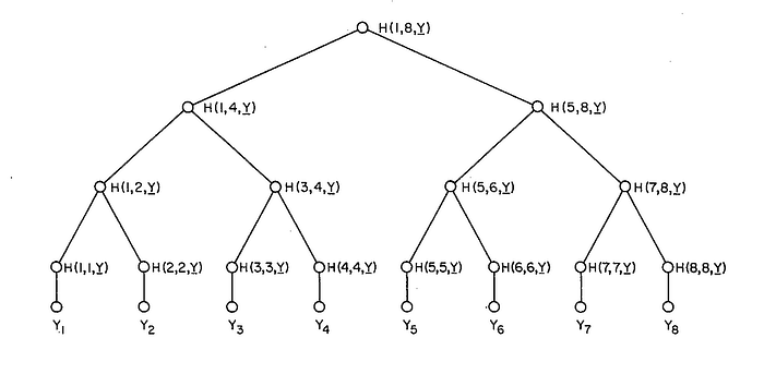 在此,数据元素 Y1 和 Y2 被哈希,然后由此创建一个哈希,最终我们到达了树的顶部,在那里可以通过顶层哈希证明所有数据的有效性,并且任何更改都可以在树中快速追踪。这真是一个美丽的模式,只需说明它是什么,它就完成了。它有四个基本声明,但基本上它是围绕树的核心图形构建的。这是最美妙形式的美丽数学。它有许多核心应用,其中之一是 Bob 拥有多个私钥,这些私钥被哈希到公钥。每当 Bob 使用他的一个私钥时,他都可以向任何人展示他知道从他的私钥到他的公钥的路径——从而表明他“没有隐瞒”。