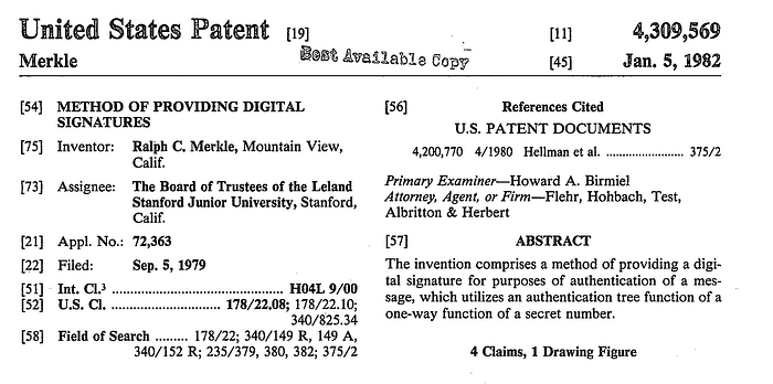 该专利被授予斯坦福大学,其中概述了一种通过哈希树验证数据的方法,其中顶层哈希可用于验证区块内的所有数据: