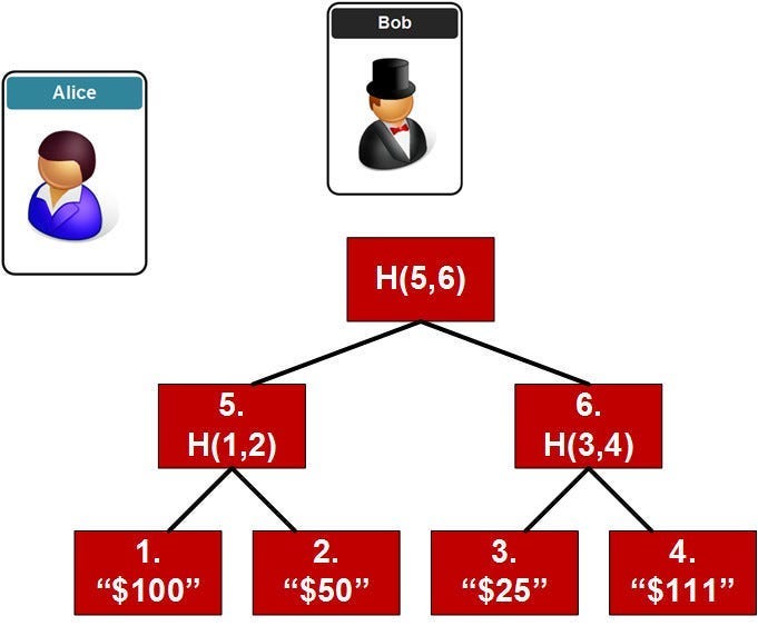 所以假设我们有 Bob The Bank 和 Alice Online,他们之间进行交易。如果他们想在一天结束时检查他们的交易,他们可以各自通过对其子节点的哈希进行非叶节点哈希来计算哈希树: