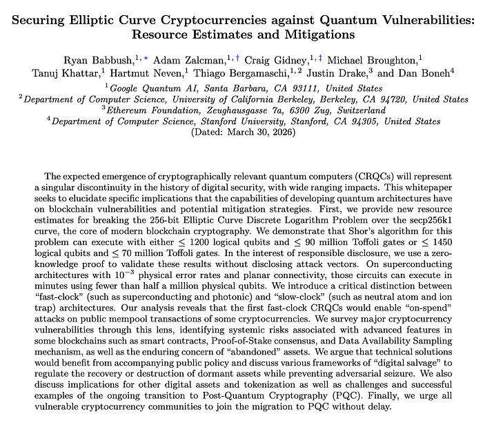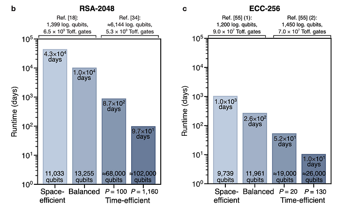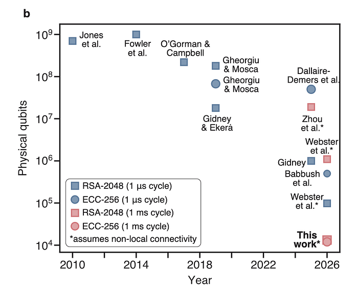 第一篇论文是由谷歌发布的白皮书。该研究估计,只需不到 500,000 个物理量子比特,就能在不到 9 分钟的时间内,通过单个签名破解椭圆曲线密码学(ECC)的私钥。