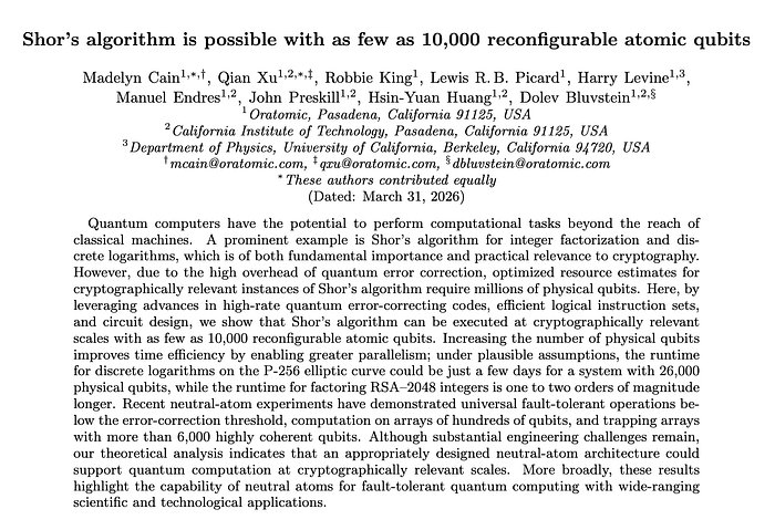 第二篇论文由来自 Oratomic 和加州理工学院(Caltech)的团队发表。他们阐述了中性原子量子计算机如何仅用 10,000 个物理量子比特破解 ECC。虽然这种方法破解需要几天而非几分钟,但目前已经在 6,100 多个量子比特上得到了验证。