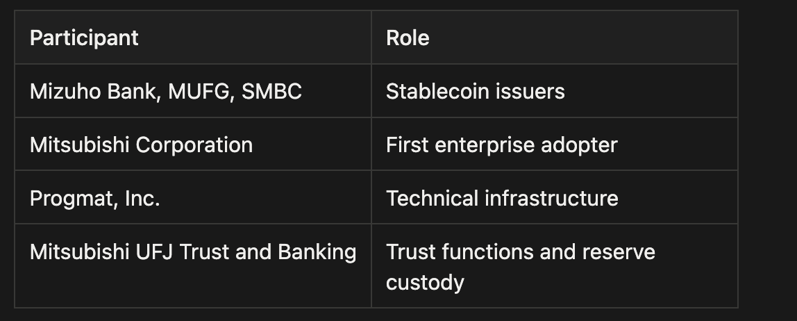 2025 年 11 月 7 日,金融厅宣布支持涉及所有三家巨头银行的概念验证。该举措属于新成立的支付创新项目(PIP),该项目设在金融厅自 2017 年起运营的金融科技概念验证中心内。这代表了 PIP 下的第一个项目,也是金融科技概念验证中心下的第十一个项目,标志着监管机构认为银行发行的稳定币已准备好进行生产测试,而不仅仅是实验。