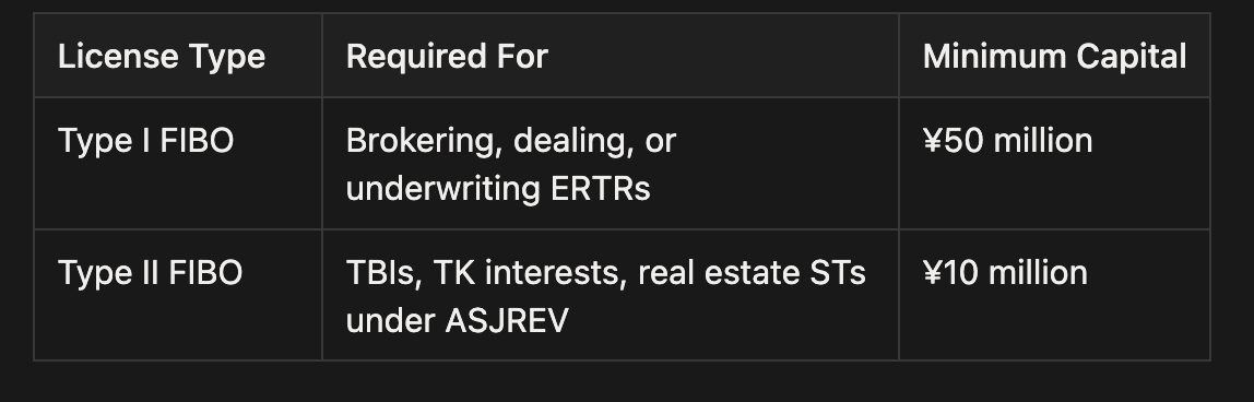 第二种 FIBO 涵盖信托受益权(TBIs)、匿名组合(TK)份额以及 ASJREV 结构下的房地产证券型代币的处理。1000 万日元的资本要求反映了较窄的业务范围。处理房地产相关代币的运营商还必须证明拥有房地产专业知识的人员,并建立适当的合规系统。