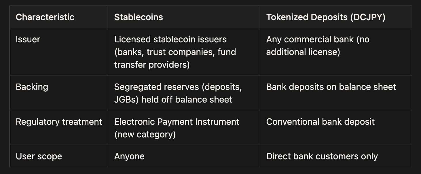 这些举措中体现的核心论点是:将稳定币和代币化存款视为金融基础设施,而非投机资产。日本正在同步测试多种方案——信托发行型稳定币、银行发行型稳定币以及代币化存款——让市场决定哪种结算层在不同的使用场景中胜出。