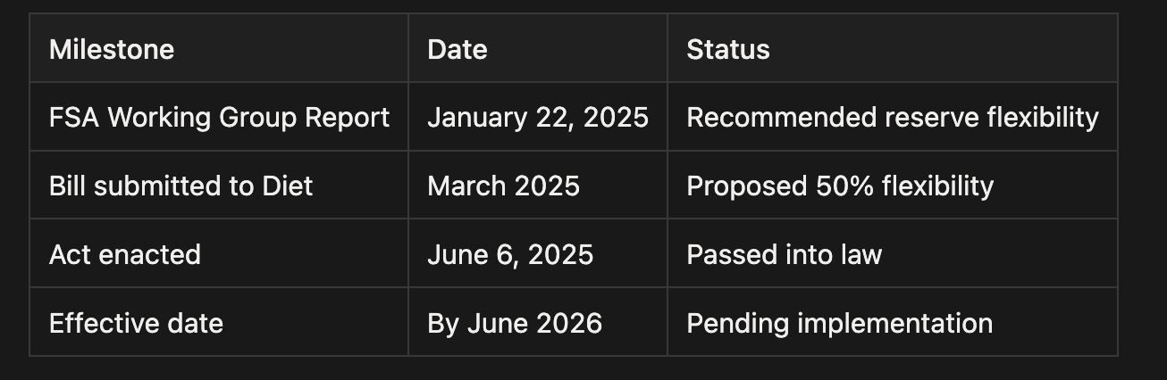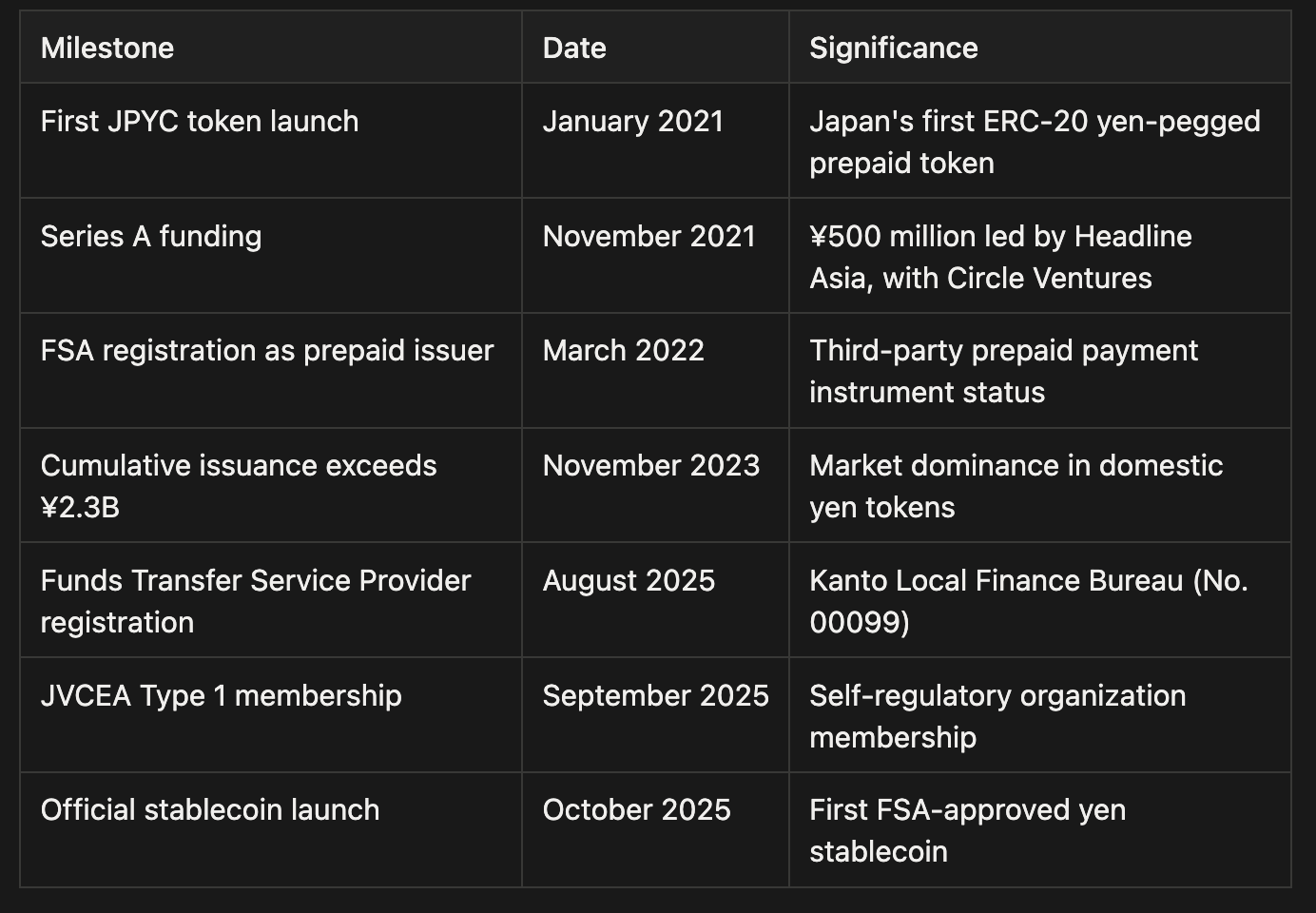 2023 年 6 月的 PSA 修订为完全的稳定币地位创造了路径。经过一年多的准备,JPYC 于 2025 年 6 月过渡到 EPI 框架,随后于 8 月在金融厅注册为资金转账服务提供商。