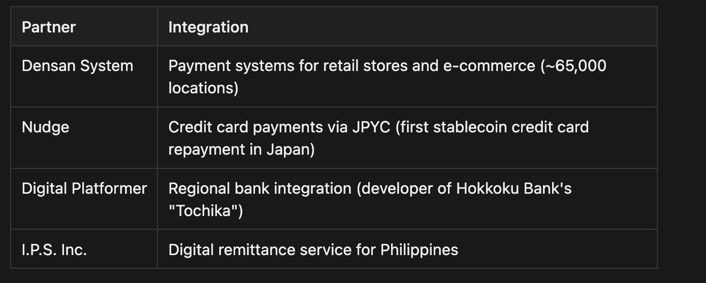 JPYC 发布时,已有多家日本技术和金融公司承诺将其稳定币整合到其服务中。