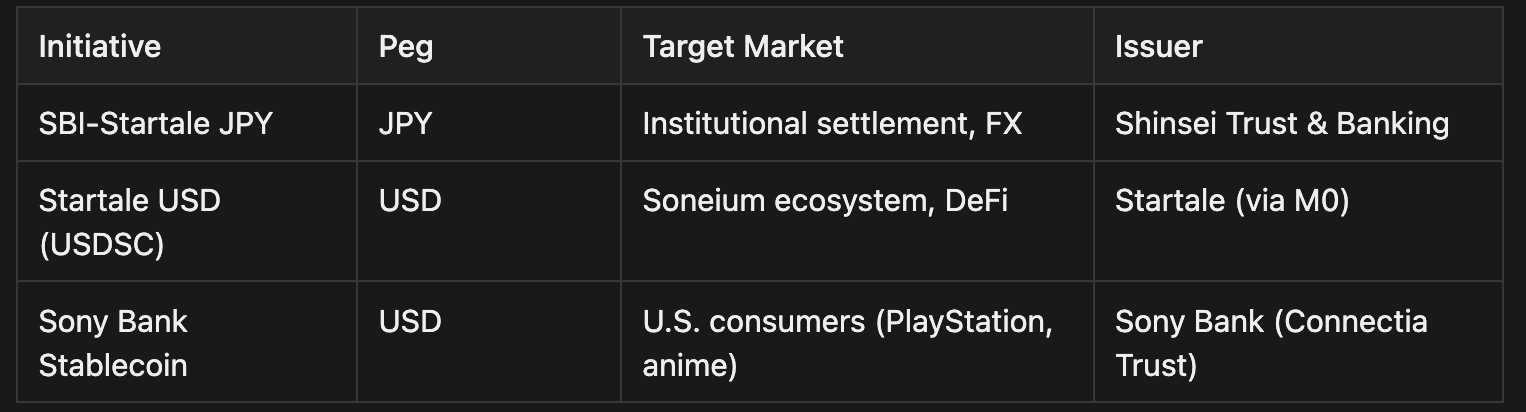 SBI-Startale 日元稳定币采用信托结构作为“第 3 类电子支付手段”,使其不受国内汇款 100 万日元的限制。这使其适用于机构和批发使用场景。USDSC 于 2025 年 12 月 3 日作为 Soneium 的原生美元稳定币发布。索尼银行(Sony Bank)正单独寻求用于 PlayStation 购买和动漫订阅的美元稳定币,并于 2025 年 10 月通过 Connectia Trust 申请美国国家信托章程。