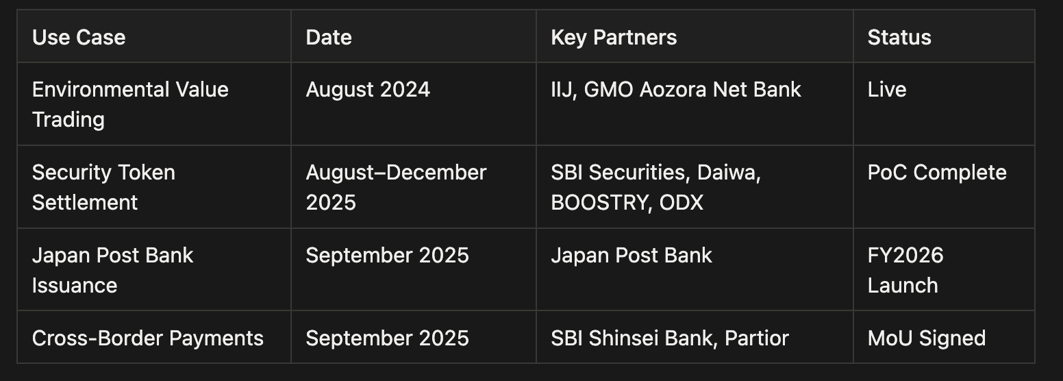 BOOSTRY 证券型代币结算代表了最重要的机构使用案例。包括 SBI 证券、大和证券、SBI 新生银行、BOOSTRY 和大阪数字交易所在内的财团已于 2025 年 8 月完成系统设计和工作流验证,并于 2025 年 12 月正式宣布。该集成将 DCJPY 连接到 BOOSTRY 的 ibet for Fin 平台,立即为市场的大部分份额创建了结算基础设施。