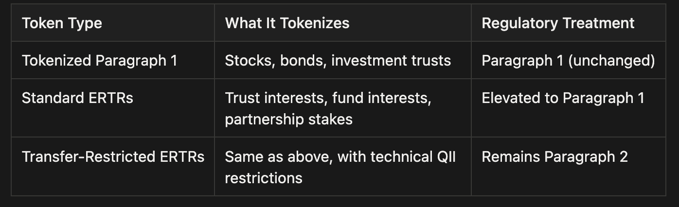 第一项证券:高流动性工具,如股票、公司债券、政府债券和投资信托份额。受更严格的披露要求、招股说明书义务和许可规则的约束。