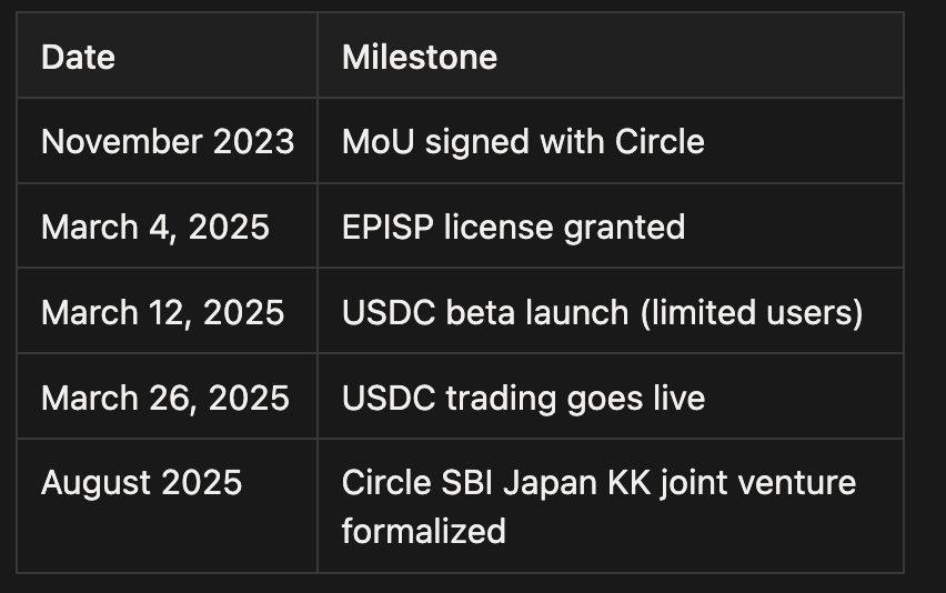 2025 年 3 月 4 日,SBI VC Trade 成为日本第一家注册为电子支付手段交易业务商(EPISP)的公司,牌照编号为关东财务局第 00001 号。该牌照根据 2023 年《资金结算法》修正案设立,授权在日本处理外国稳定币。